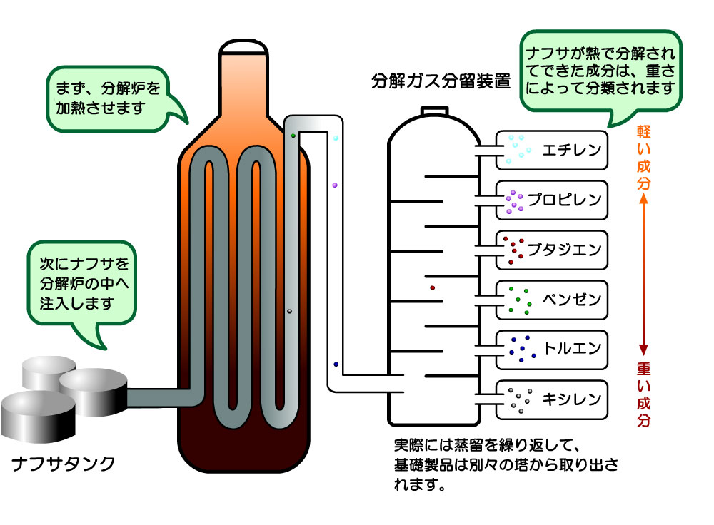 取れたナフサをさらに高温で分解すると、エチレンやプロピレン、ブタジエンなどの物質(石油化学基礎製品)が生まれます。